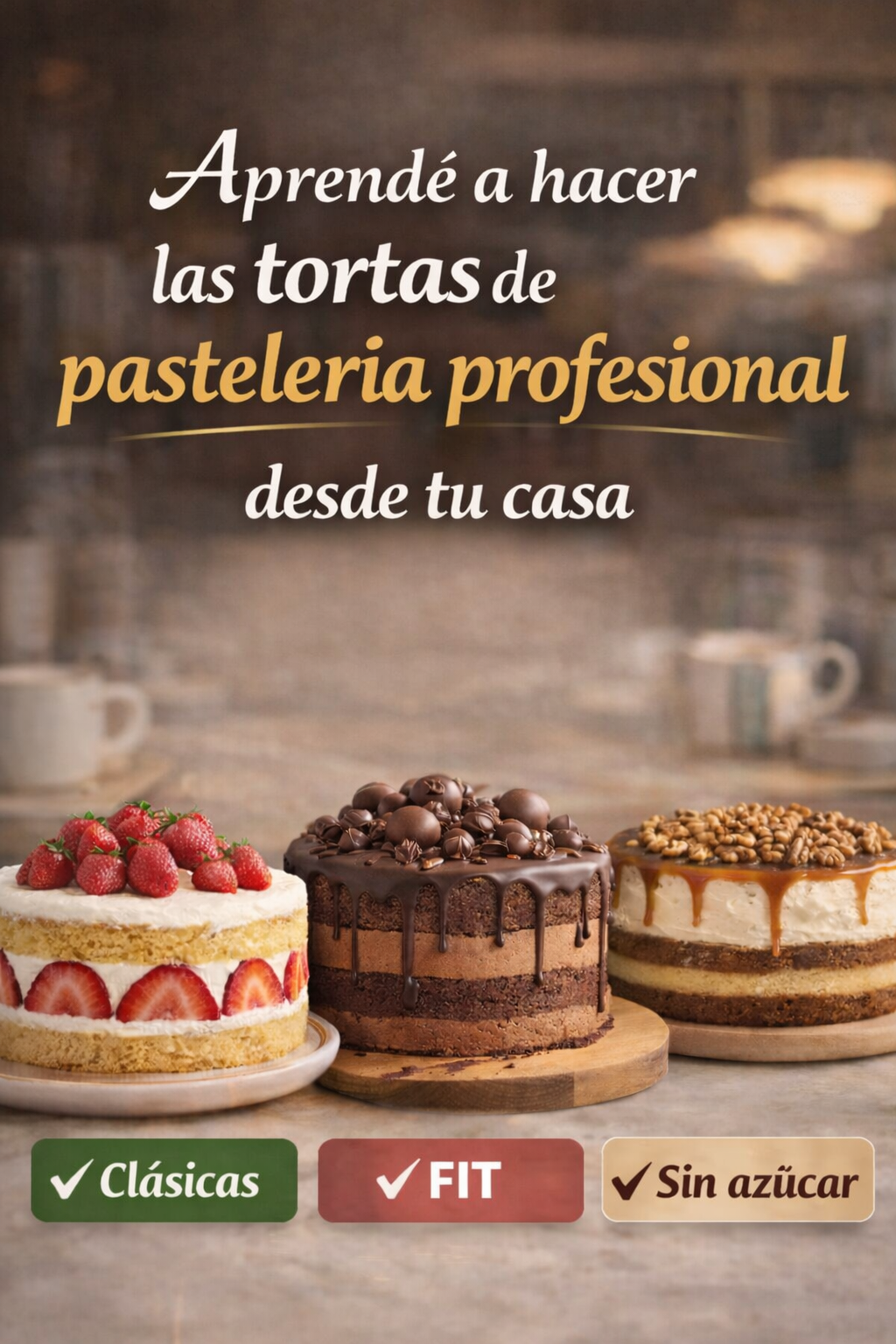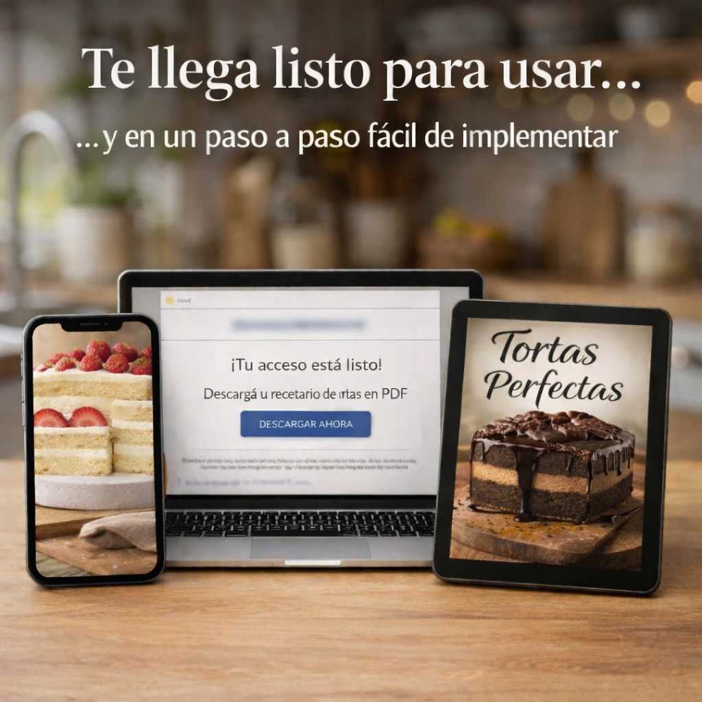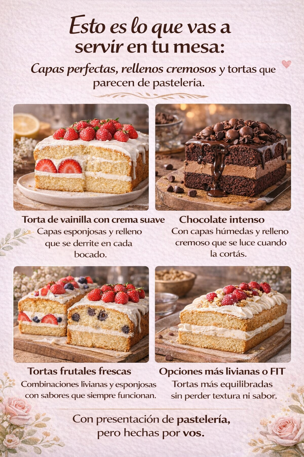 Bizcochuelos húmedos, rellenos equilibrados y terminaciones prolijas. Recetas explicadas paso a paso para que tus tortas se vean y sepan como de pastelería. Lo descargás y lo tenés listo para usar en el celu, tablet o compu.